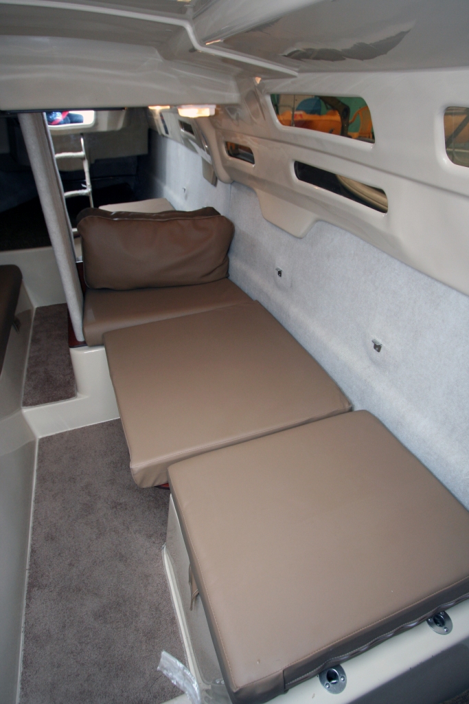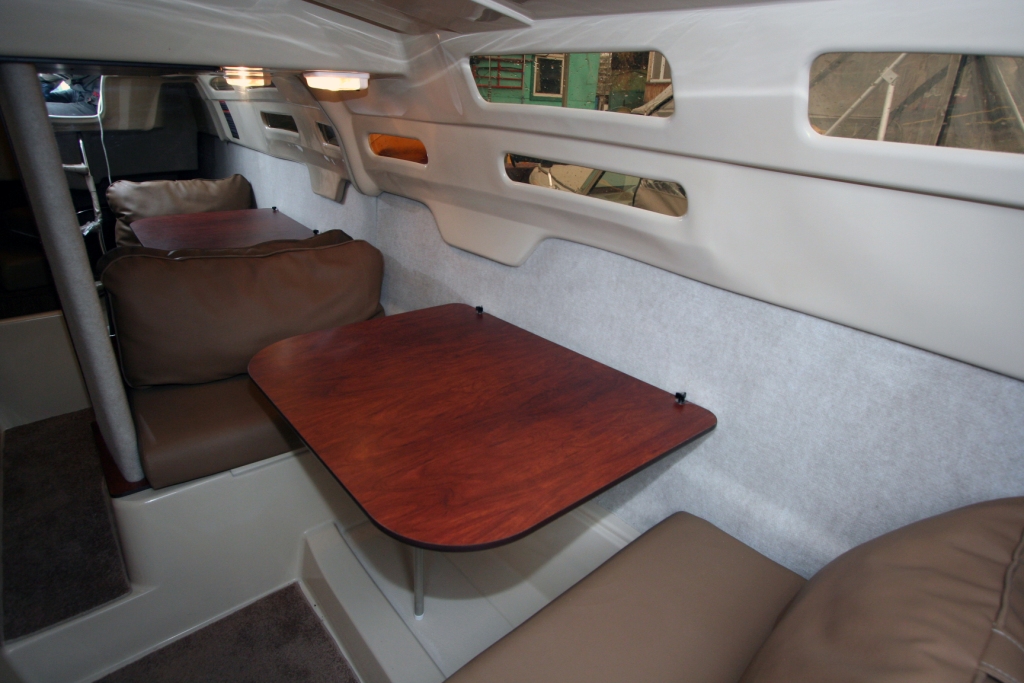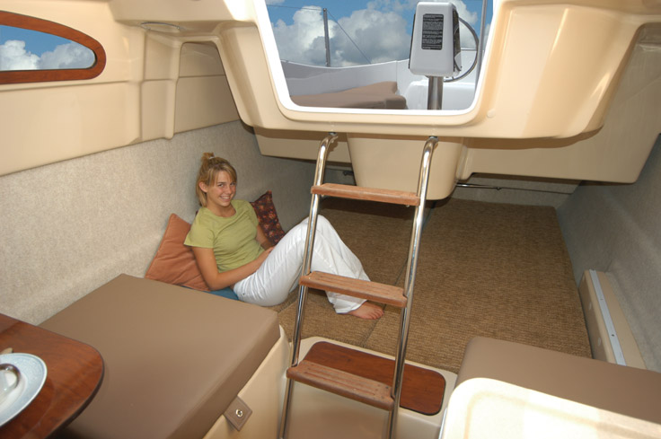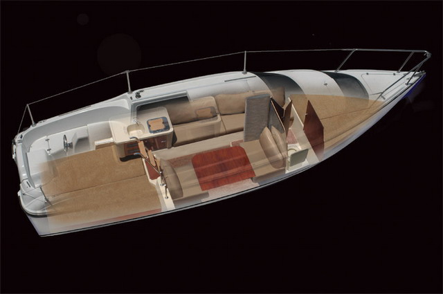 | Внутри надстройки, которая защищает от непогоды, можно стоять в полный рост и с удобствами разместить семью. Большие диваны могут использоваться как сидения, так и как спальные места. На камбузе, расположенном по левому борту, много места для хранения, оборудована мойка, предусмотрена возможность установить духовку. Поверхность разделочного стола расположена на стандартной для кухни высоте. За зеркальной переборкой полностью изолированное помещение гальюна, абсолютно необходимого для любого выхода продолжительностью более нескольких часов. Дальше в нос находится большое двуспальное место,большой форлюк обеспечивает хорошую вентиляцию. За большим и устойчивым столом с комфортом могут обедать четыре человека. Всего в салоне могут разместиться до 8-ми человек. |