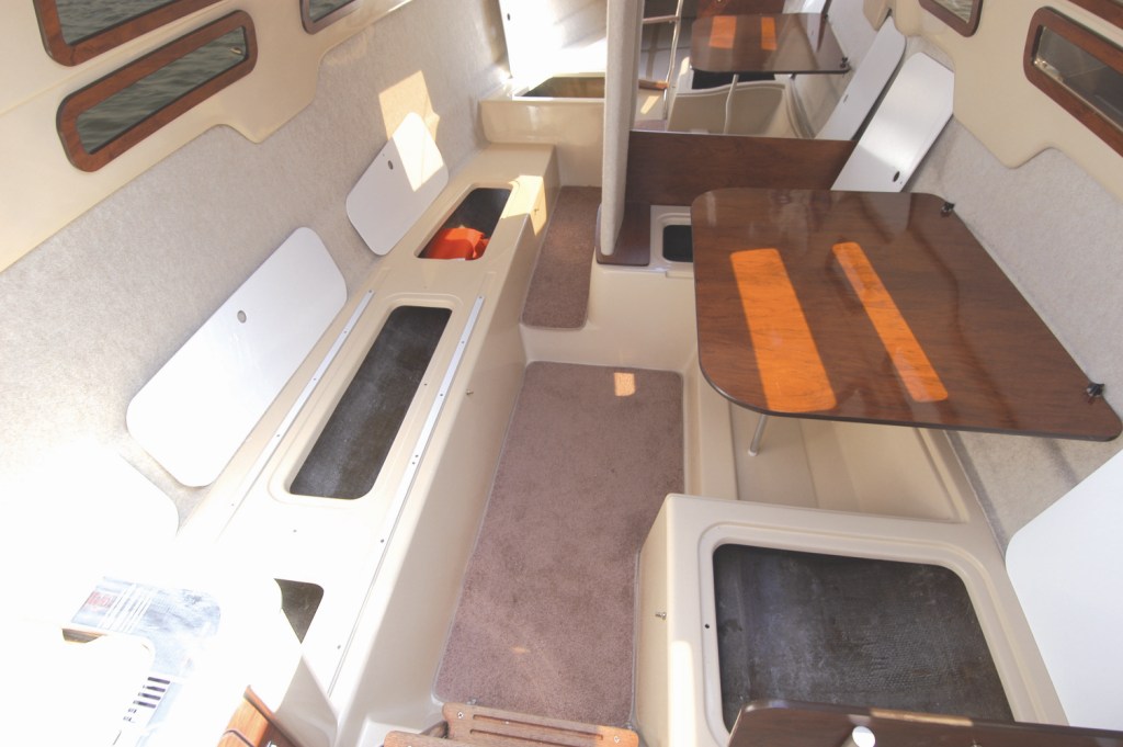 Вид от входа вперед, показаны рундуки под каждым сиденьем. Все подушки сняты, а лючки подняты, чтобы Вы могли убедиться, как много места предусмотрено для хранения вещей.