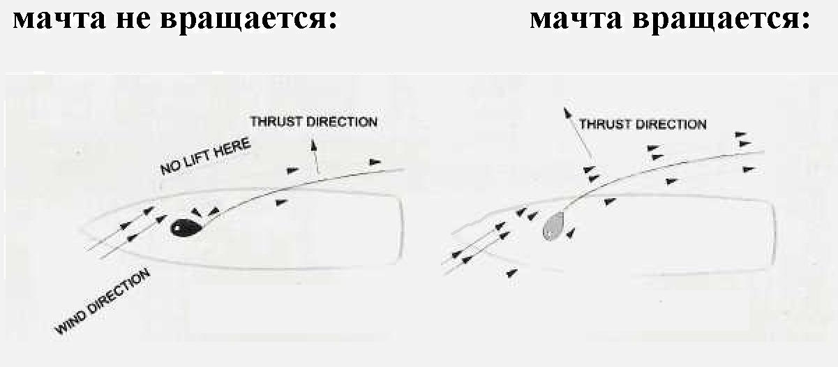 | На рисунке показаны направление потока ветра, аэродинамическая сила, а также завихрения (турбулентность) потока за неповоротной мачтой. |