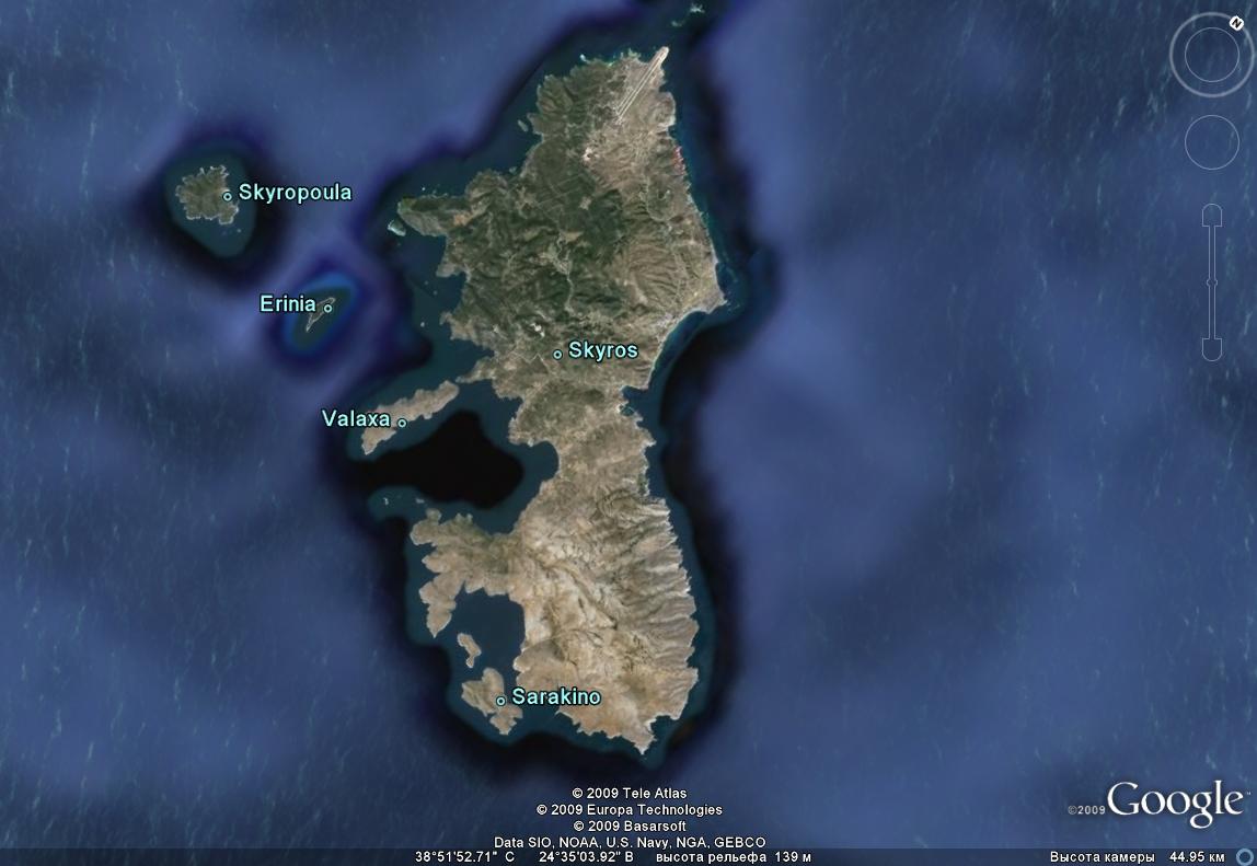 Северная часть острова покрыта лесом, в том числе лесом покрыта и самая высокая точка острова — гора Олимп (высотой 792 метра). Южная часть острова безлесая и скалистая. Столица острова Скирос (местное название Хора). Улицы города застроены домами кубической формы, довольно необычными для Греции. В городе есть 3 музея. В Муниципальном музее представлен интерьер, характерный для Скироса в прошлом. В Археологическом музее есть экспозиция артефактов минойского периода. В местных лавках продаются изделия из меди, резьба по дереву, керамика и вышивка. Становление и развитие местных ремесел, а также предметы владевших островом византийцев, венецианцев и турок представлены в частном Музее Фальтаитиса. На горе над городом расположен построенный венецианцами замок Кастро. Другими важными достопримечательностями острова являются византийский монастырь Святого Георгия и археологическое селение бронзового века Паламари.
